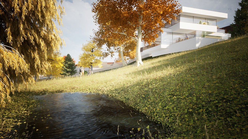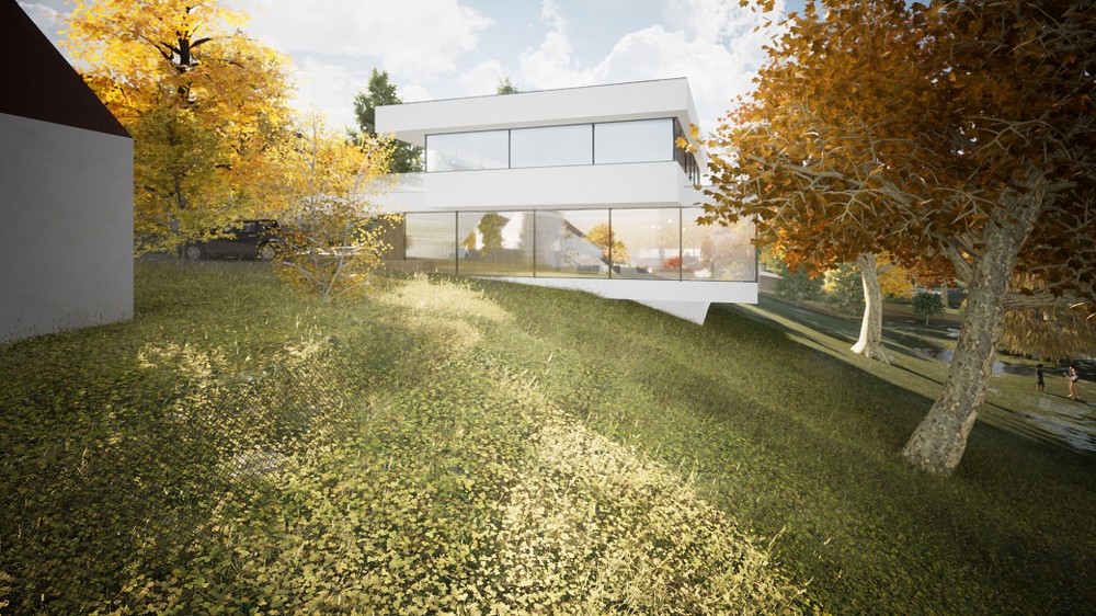 Obec Druztová u Plzně je tradičně strukturovaná vesnice s dlouhými hospodářskými staveními umístěnými kolem středové vodní plochy napájeného říčkou, která modelovala okolní terén. Do staré struktury však vstupuje již několik novostaveb různých proporcí i s rovnými střechami, jak se lidé stěhují z města a mají již jiné potřeby. Samotný dům se nalézá na vyvýšeném místě se severním svahem. Záměrem klienta je orientace na tento severní výhled mezi dvěma ořecháči a zároveň však získat do interiéru jižní slunce skrz otevřené atrium schodiště. V odpoledních hodinách potom půjde slunce na západní terasu, jenž je otevřená do zahrady. Spodní hmota obsahuje velký obývací pokoj , jakousi palubu nad svahem, do kterého se částečně dům zařezává a částečně nad ním pocitově levituje. Horní uskočená hmota je velikostně menší ale svým převisem tvoří lehké stínění spodní terase. Majitelé milují funkcionalistickou architekturu, která vstupuje do tradiční vesnice dosti těžko. Záměrem bylo tento kontrastní směr ještě více posílit minimalistickým pojetím vnějších fasád, tak jakoby zde přistálo UFO. Uvidíme jak se do budoucna bude vesnice, která se stala suburbanií Plzně časem proměňovat a přestavovat. Možná svým zásahem částečně proměníme charakter obce, tím, že se odprostíme od tradičního pojetí sedlových střech. Tzn. je to otázka přístupu k místu a charakteru okolí. Pozemek je velký a odstupy od ostatních staveb jsou velké tak si tento přístup můžeme dovolit. Doufám, že Druztové tímto zásahem neublížíme.